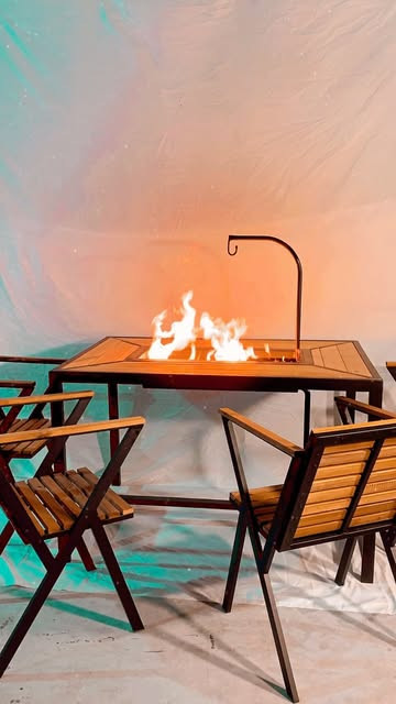 میز آتشدان به همراه صندلی چهار نفره ما بهترین انتخاب برای کافه ها و باغ و ویلا با بهترین کیفیت میز خیلی خاص برای دورهمی هاتون پروفیل به همراه جوش co2 چوب ترمو وود ضدآب و ضد زنگ مناسب فضای رو باز ابعاد قابل تغییر